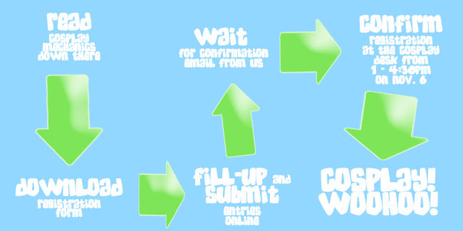 - 3) Send the .doc file to contests@up-ame.org along with the necessary references (pictures, music/BGM and video) as attachments. Indicate 'COSPLAY - INDIVIDUAL', 'COSPLAY - GROUP' or 'COSPLAY - DANCE' as the subject, depending on the entry. [Note: For Group and Dance cosplayers, please send one reference picture per character]